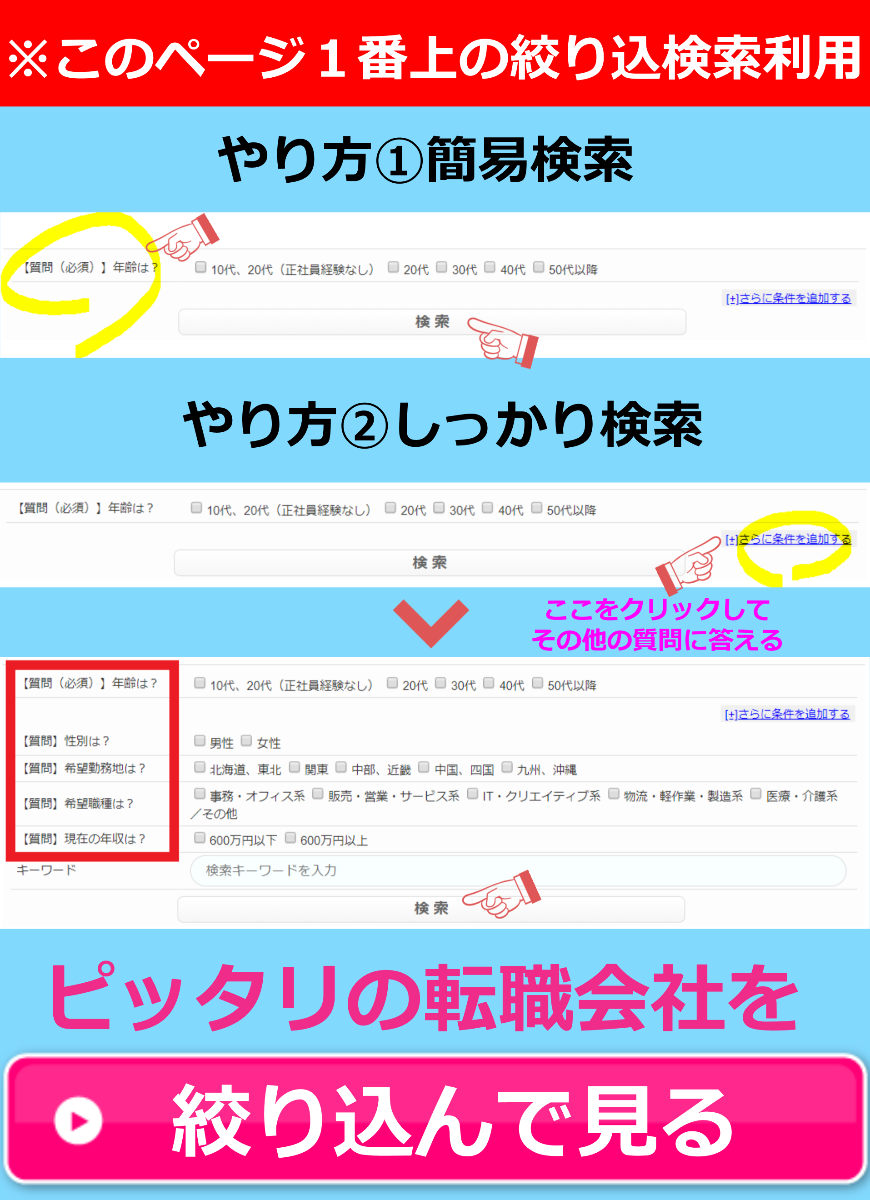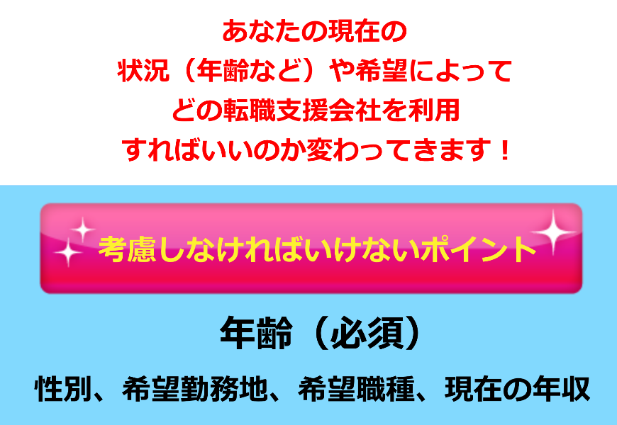 私たちが提携している転職支援会社から、年齢、性別、希望勤務地、希望職種、現在の年収を考慮すれば、あなたにピッタリの転職支援会社がわかります!